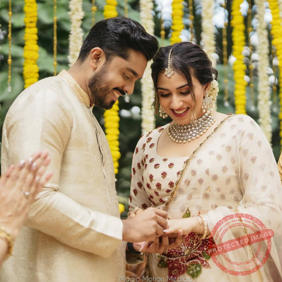 ക്രീം ലെഹങ്കയില് സുന്ദരിയായാണ് മാളവിക വേദിയില് എത്തുന്നത്. സഹോദരന് കാളിദാസും താരിണിയും പാര്വതിയും ചേര്ന്നാണ് മാളവികയെ വേദിയിലേക്ക് ആനയിച്ചത്.