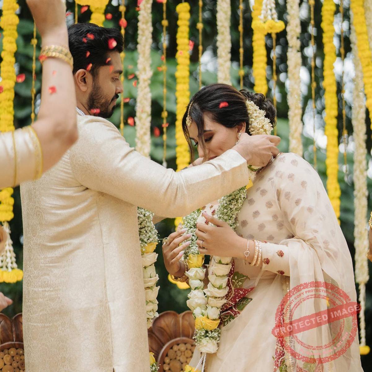 ക്രീം ലെഹങ്കയില് സുന്ദരിയായാണ് മാളവിക വേദിയില് എത്തുന്നത്. സഹോദരന് കാളിദാസും താരിണിയും പാര്വതിയും ചേര്ന്നാണ് മാളവികയെ വേദിയിലേക്ക് ആനയിച്ചത്.