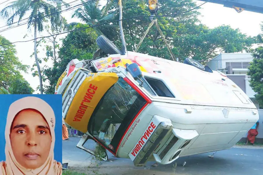 വിഷം ഉള്ളില്ച്ചെന്ന യുവാവുമായി ആശുപത്രിയിലേക്ക് പോകുമ്പോള് ആംബുലന്സ് മറിഞ്ഞ് യുവാവിന്റെ അമ്മ മരിച്ചു. നല്ലേപ്പിള്ളി നരിച്ചിറ തെക്കേദേശത്ത് ജോറാമ്മ (53) ആണ് മരിച്ചത്. യുവാവിനെയും മാതാവിനെയും കൂടാതെ ജോറാമ്മയുടെ മകളുടെ ഭര്ത്താവ് റഹീം, സഹോദരന്റെ മരുമകള് റഹ്മത്ത് എന്നിവരും നഴ്സുമാണ് വാഹനത്തിലുണ്ടായിരുന്നത് , അപകടത്തില് ഇവര്ക്കും പരിക്കേറ്റു.