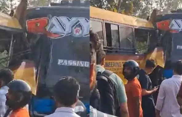 കോളേജ് ബസും സ്വകാര്യ ബസും കൂട്ടിയിടച്ച് അപകടം. അപകടത്തിൽ നാല് വിദ്യാർത്ഥികൾക്ക് പരിക്കേറ്റു എന്നാണ് നിലവിലെ വിവരം. ജയ് ഭാരത് കോളേജിന്റെ ബസാണ് സ്വകാര്യ ബസുമായി കൂട്ടിയിടിച്ചത്. കോളേജ് ബസിലെ ഡ്രൈവറുടെ കാൽ കാബിനിൽ കുടുങ്ങി പരിക്കേറ്റിട്ടുണ്ട്.
